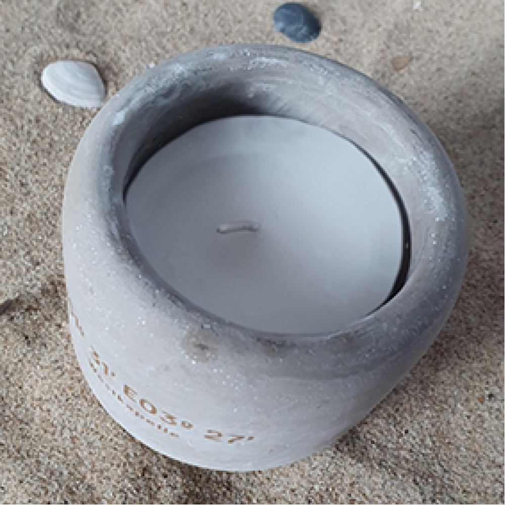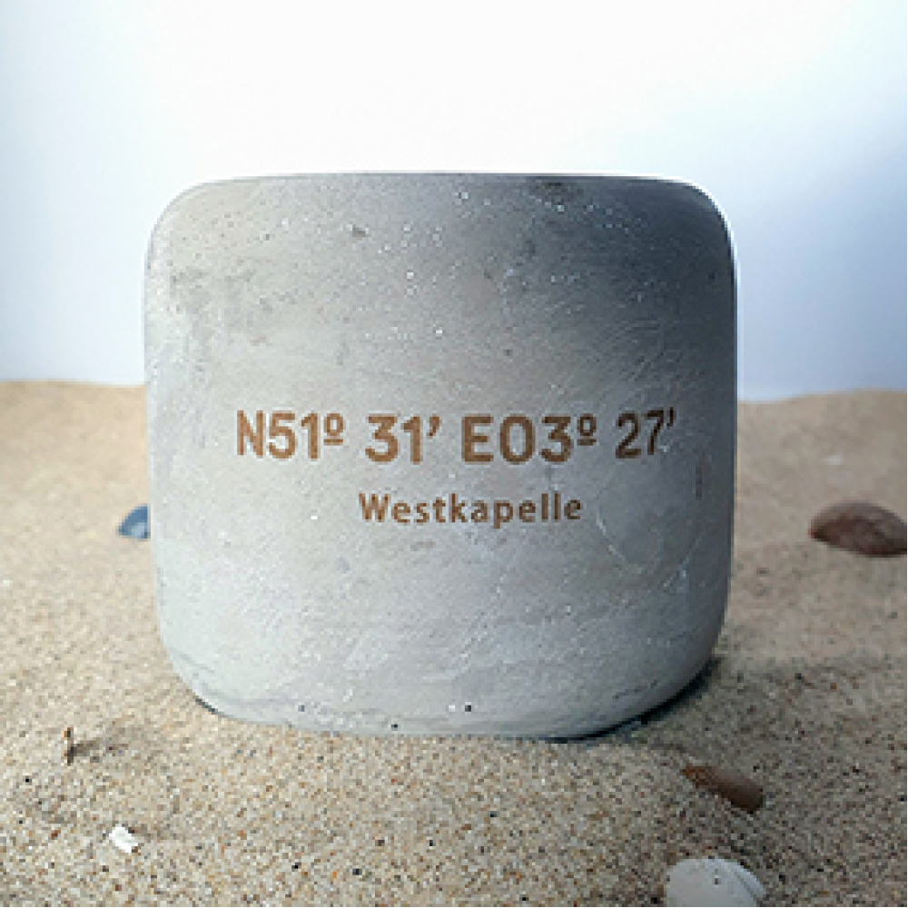 Betonnen potje met de coördinaten van Westkapelle met (losse) kaars.