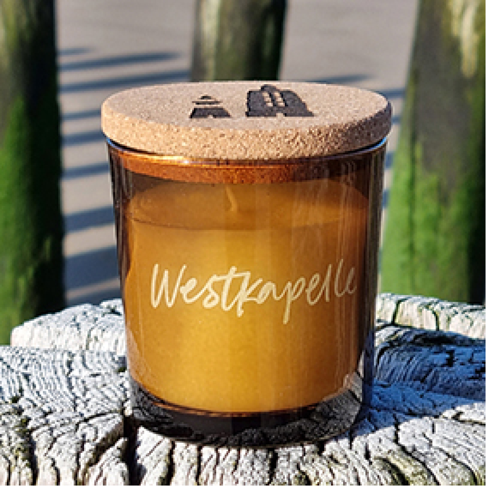 Geurkaars in gegraveerd glas met een kurken deksel met de vuurtorens van Westkapelle.