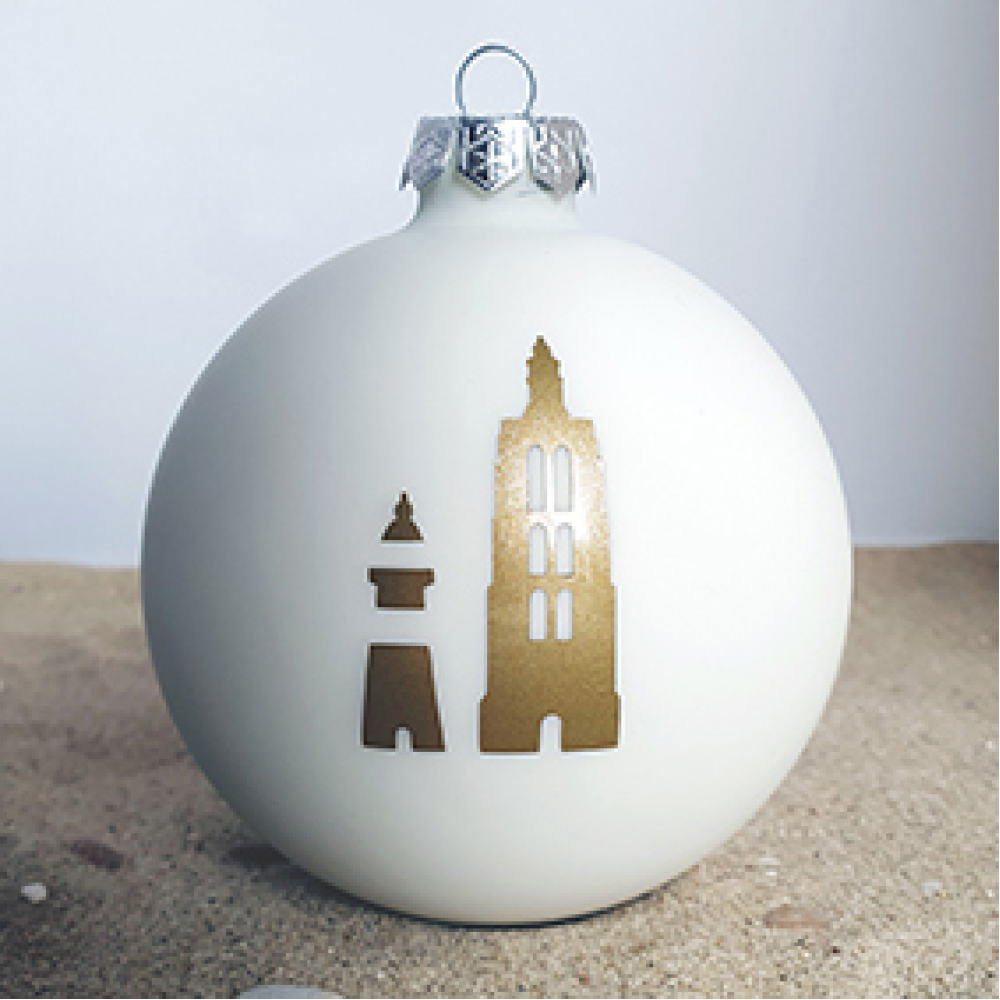 Glazen kerstbal met print van de twee vuurtorens van Westkapelle.