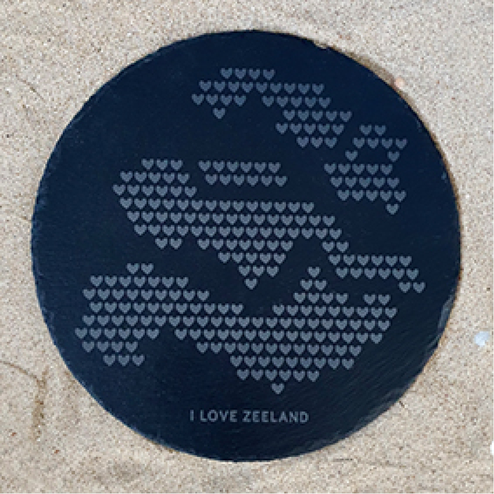 Grote ronde leistenen onderzetter met de provincie Zeeland in hartjes.