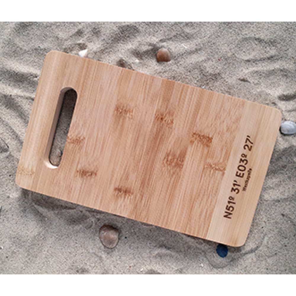 Bamboe plank met de coördinaten van Westkapelle gegraveerd.